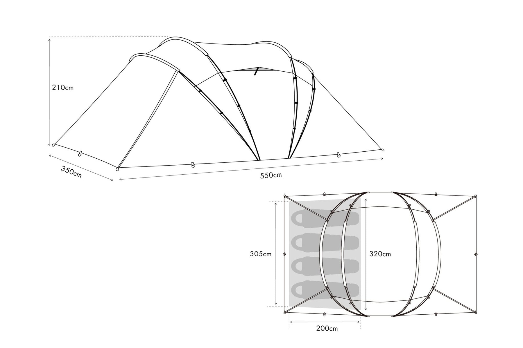 付属のインナーテントには5人を収容でき、更にインナーテントを追加することで最大10人収容することも可能です。